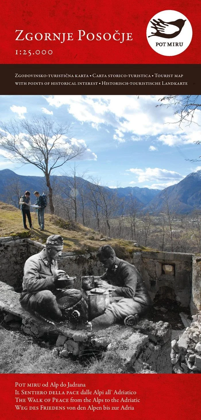 Historisch-touristische Landkarte für den Weg des Friedens im Abschnitt zwischen Bovec/Flitsch und Tolmin/Tolmein In 2007, the outdoor museums and the most important remains and memorials of the Isonzo front in the Upper Soča region were interconnected into the Walk of Peace. It is dedicated to the memory of numerous victims of the First World War. Trekking along the about 100 km long Walk of Peace, or only along a part of it, offers to every visitor an active rest in the wonderful, tranquil, unspoiled nature marked with the river Soča, the world of medium-high and high mountains, flocks of sheep and goats, and still active alpine pastures in summer, and the history of the First World War. The walk starts at Log pod Mangartom at the entrance to the mine shaft named Štoln, and ends at the outdoor museum Mengore near Most na Soči. It is divided into five sections and trekking along each of them can be done in one day. It runs past military cemeteries and chapels, Kluže Fortification, outdoor museums, the Koritnica gorge, the Soča gorge, the idyllic mountain alps, the Kozjak fall, two charnel houses, at Kobarid and Tolmin, a memorial church of the Holy Spirit on the Javorca plateau, the Tolminka gorge, etc.